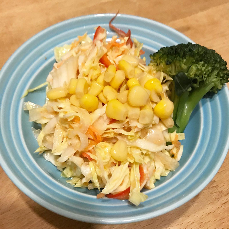 にんじんと玉ねぎすりおろして作ったドレッシングを欠かさず作り置きしてるのでキャベツ、パプリカ、新玉ねぎ、にんじんでサラダも。
