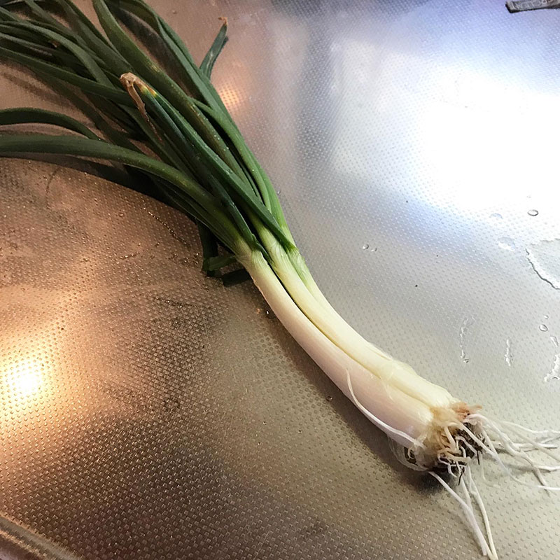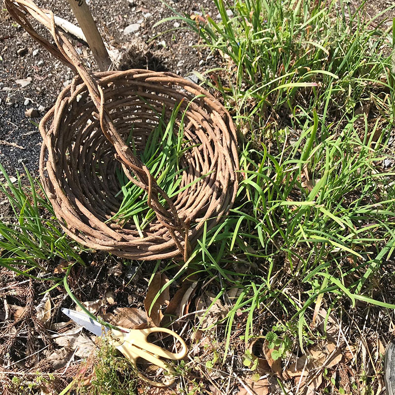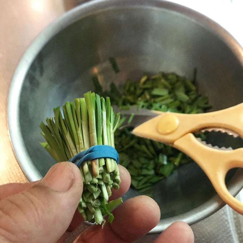 ニラ醤油用にニラの収穫。畑で根元のゴミや枯れた葉先をカット。すごい手間。