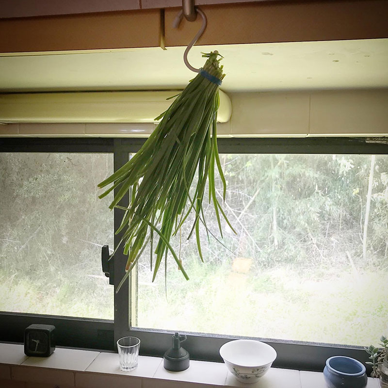 長く保存できる様に洗ったニラはシンクの上に吊るして水気をしっかり切る。