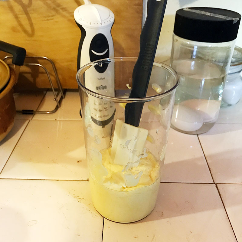 夕食にマヨネーズいるのに昼にブロッコリーにつけて食べきってた。急いで作る。材料用意したらハンドブレンダーで30秒。