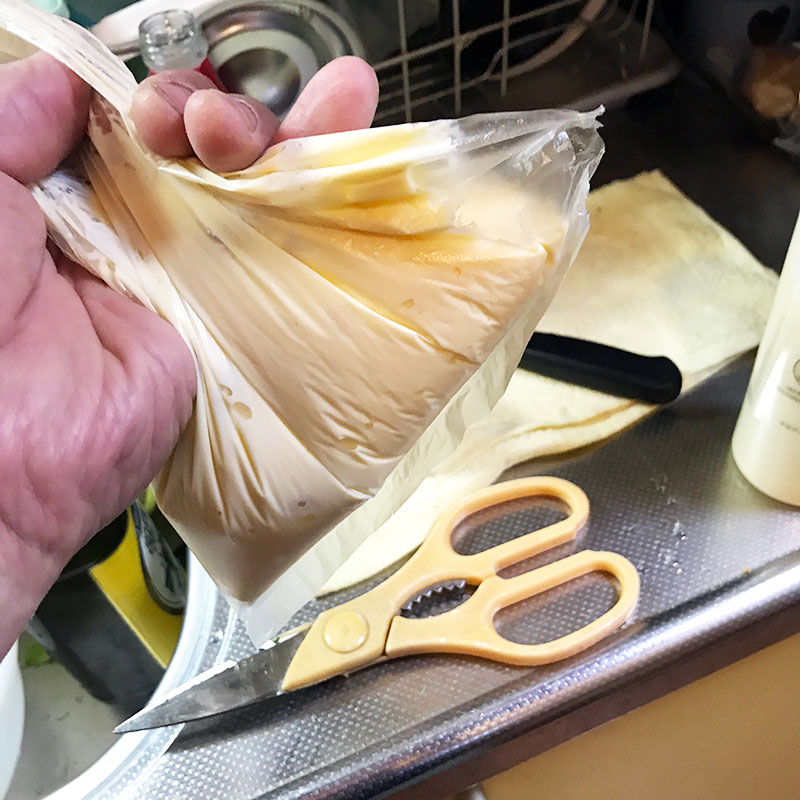 口径の小さな容器に移す。これでお好み焼きや焼きそばに線状に絞り出せる。