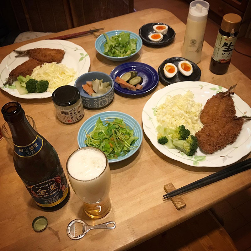 パチパチいってるのはカミさんがイワシフライ揚げてくれてる音。