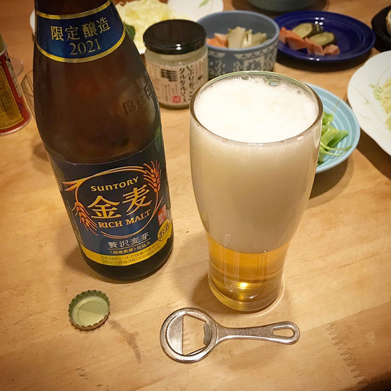 シール集めてもらった限定醸造、瓶詰め金麦。2本目からはいつもの赤い金麦。