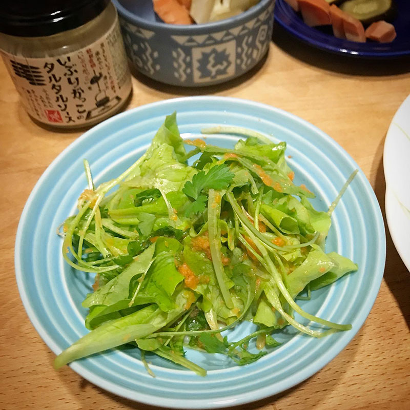 7種類を収穫してにんたまドレッシングでサラダ。今シーズン初。嬉しく美味しい。