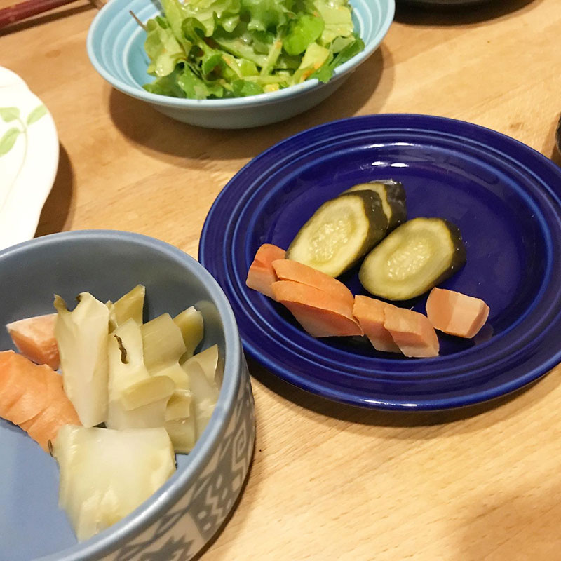 にんじん、きゅうり、ブロッコリーの茎。1ヶ月くらい前から冷蔵庫から出して管理してるけど気温が上がってすぐ漬かる。今のぬか床はやや酸味が強い。