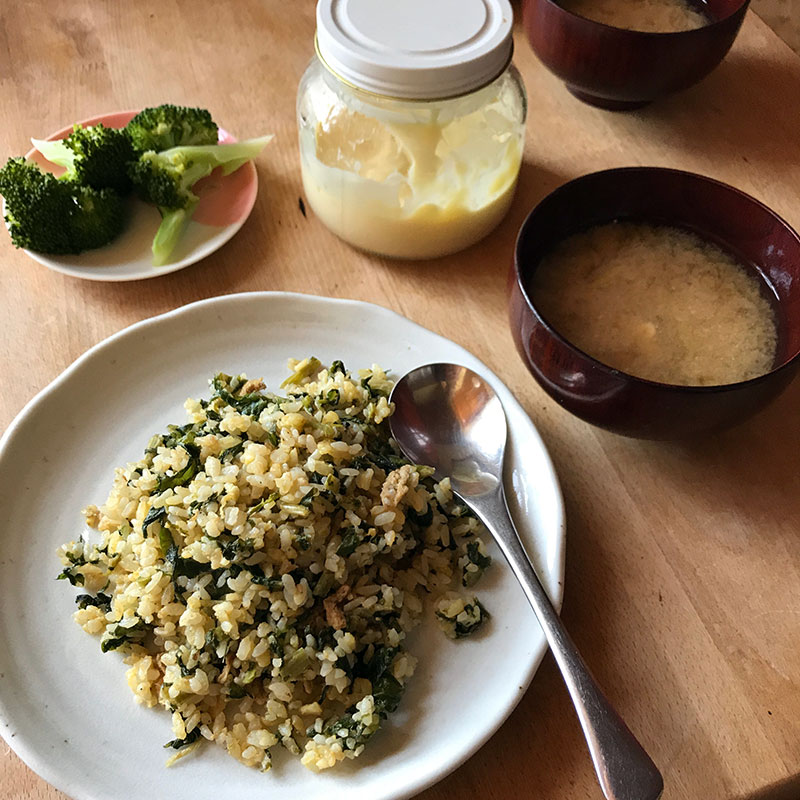 料理のジャンルでカミさんと僕の分担がなんとなく決まっている。久しぶりにカミさんの炒飯。大根葉と自家製ニラ醤油の炒飯の昼飯。美味しい。