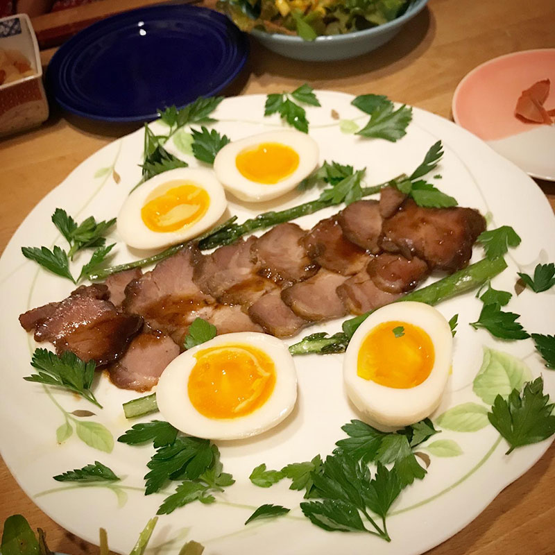 昨晩、仕込んだ焼豚と半熟卵。山本ゆりさんのレシピで炊飯器で放ったらかしで作った焼豚と半熟に茹でた卵を白だしを水で割った出汁に漬けた味付け卵。畑で冬越ししたイタリアンパセリが今盛りで、しかも甘くてとても美味しいのでいろんな料理に山の様に盛り付けてる。飾りじゃなくて全部食べてしまう。