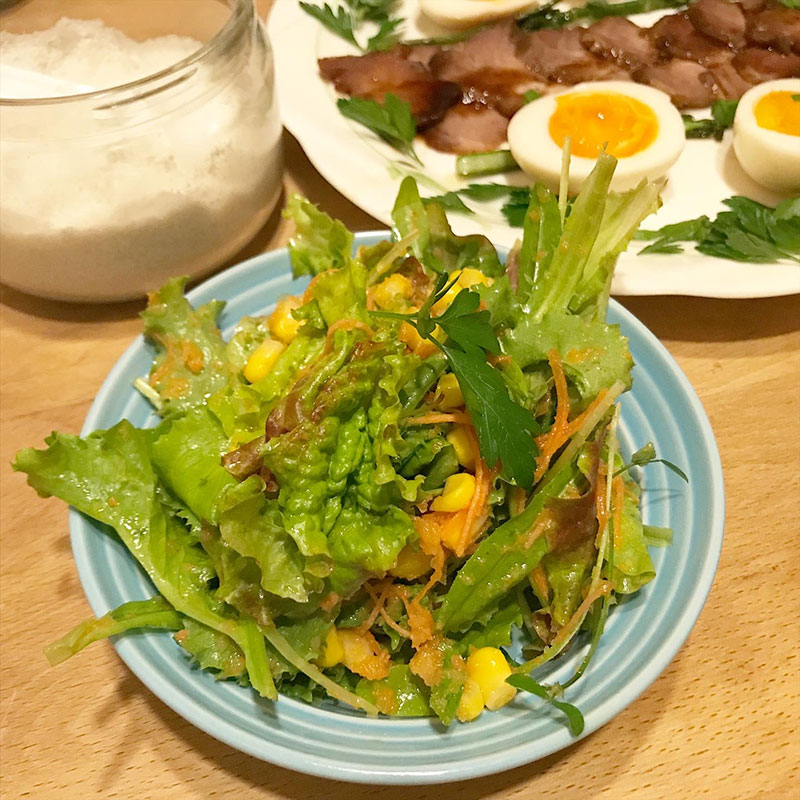 ルッコラも混ぜて。苦味、甘味、酸味などいろんな味のリーフがあってそれらが混ざりあってとても美味しい。玉ねぎとにんじんをすりおろして作ったドレッシングで。