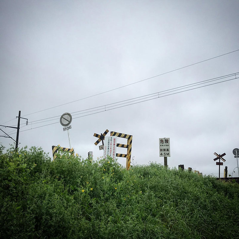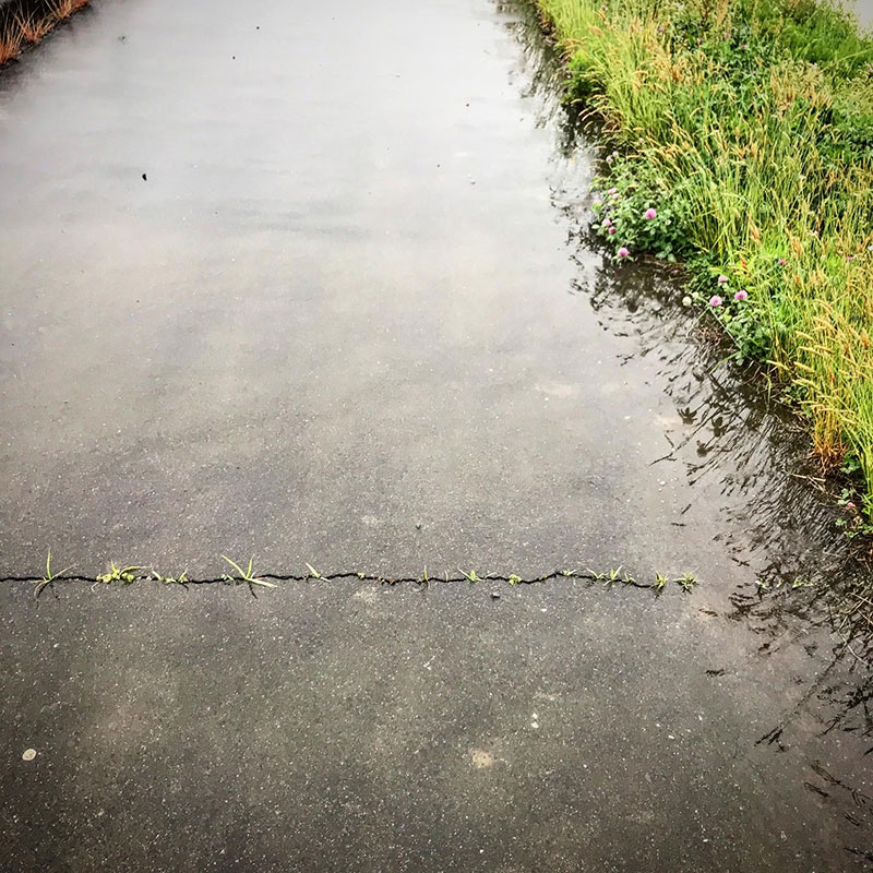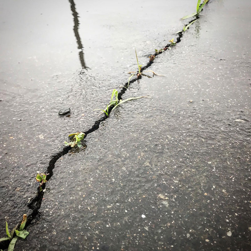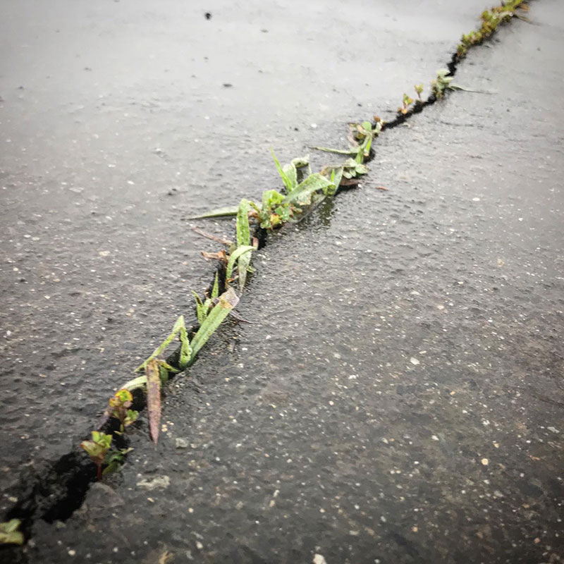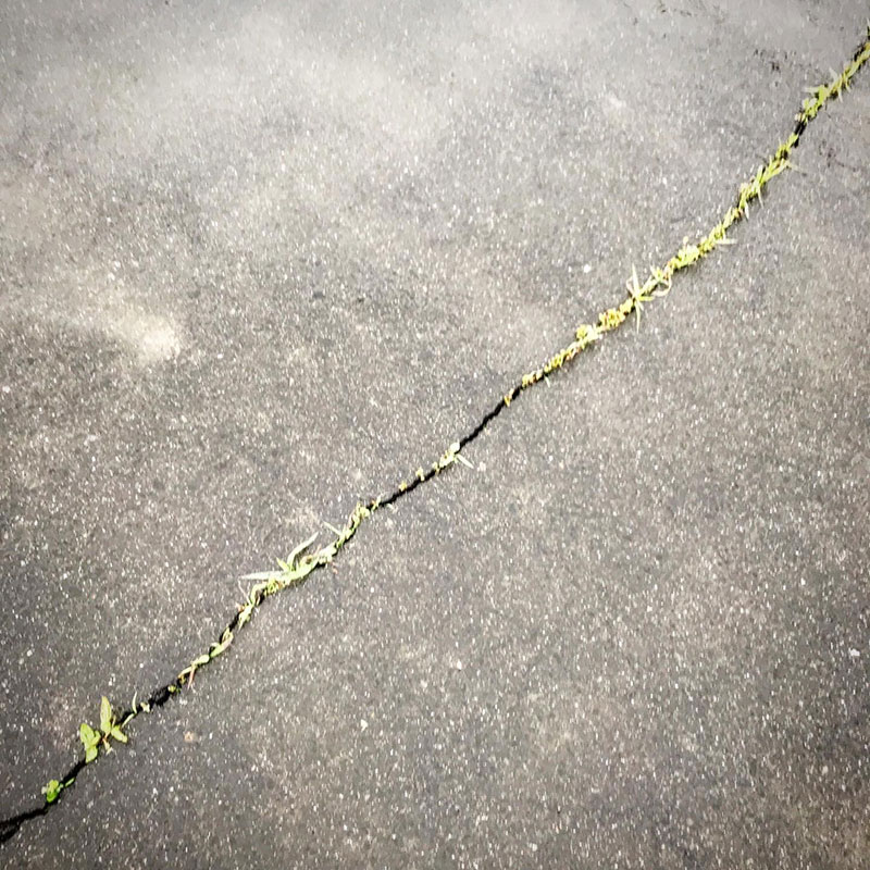 大地震で断層にできたアスファルトの裂け目に生きる草たち。