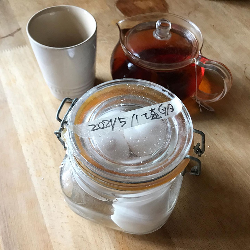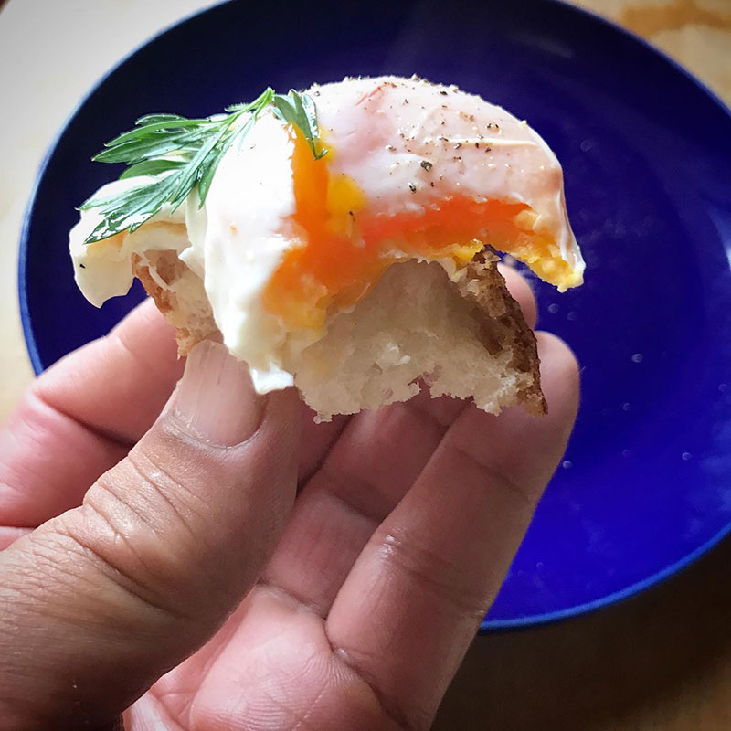 早朝から働いたのでいつもは抜いてる朝食食べる。塩卵の目玉焼きをバゲットにのせて。30%の濃度の塩水に1ヶ月漬け込んでアスパラガスのビスマルク作ろうと4つ漬け込んでるうちのひとつを試食してみる。前回は3%の濃度で全然塩味が入ってなかった。まだ20日目だけど今朝のは美味しく塩味が入ってた。