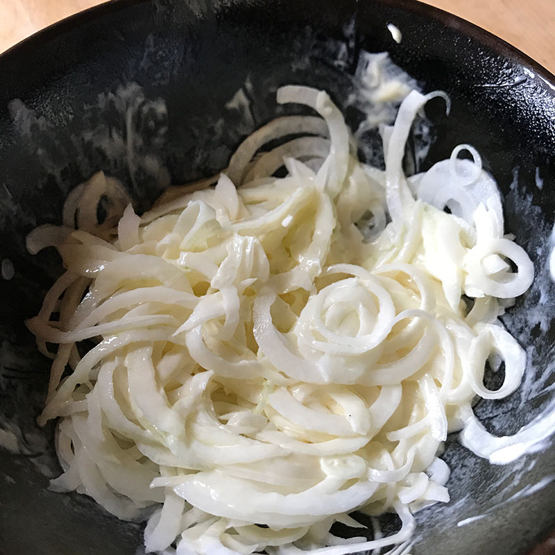 ラーメンだけの昼飯だとアレなのでまたいただいた新鮮な新玉ねぎをスライスして自家製マヨネーズとリンゴ酢でサラダに。なんて美味しい。