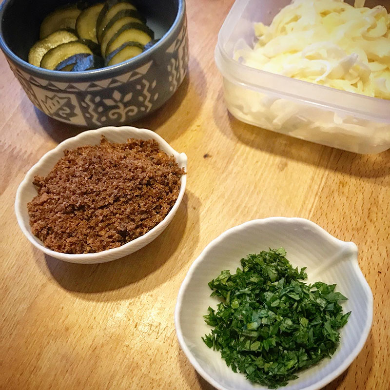 味変できる様にニンニクパン粉と畑で大きく育ってるイタリアンパセリのみじん切りも用意。