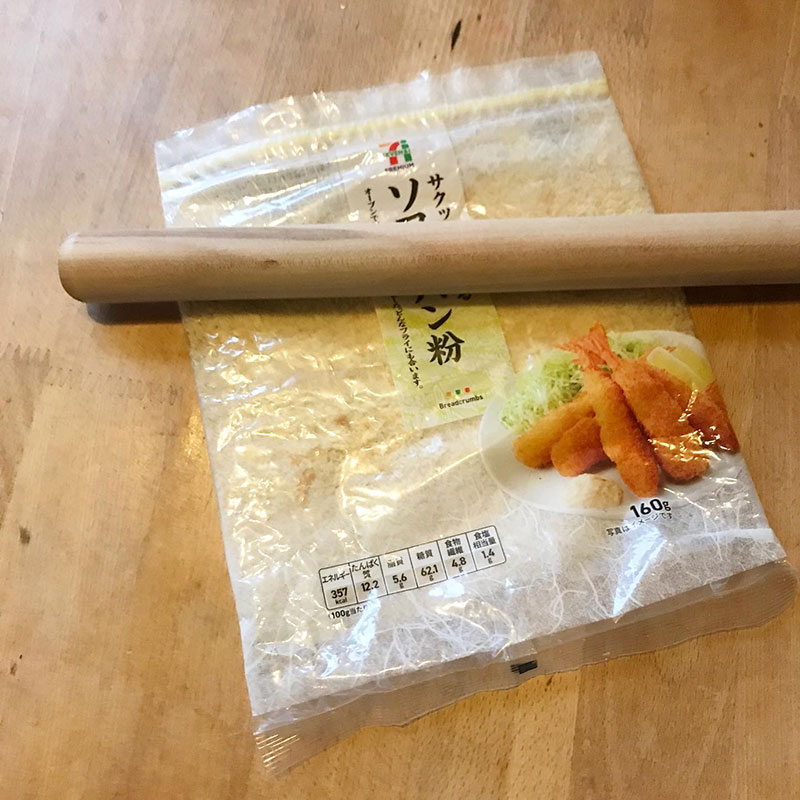 パン粉を袋の上から綿棒で細かくして(細かくしないバージョンも美味しい)