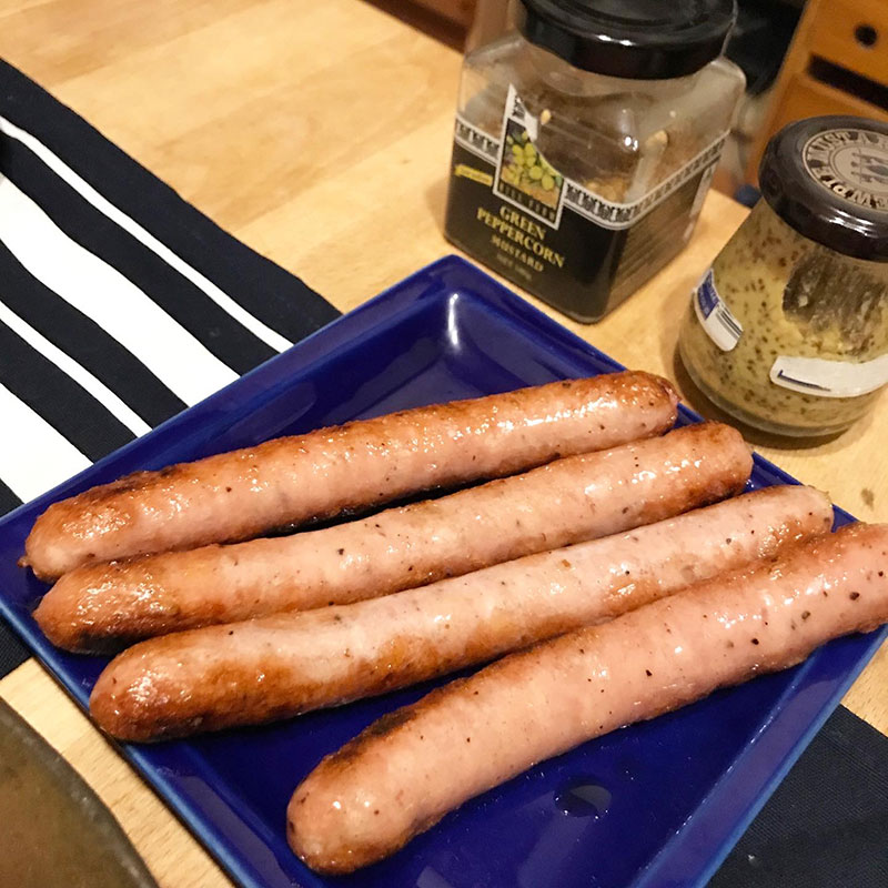 フライパンでボイル後焼いたソーセージを粒マスタードと