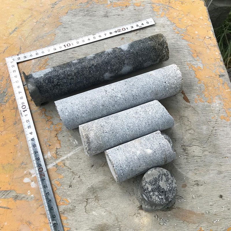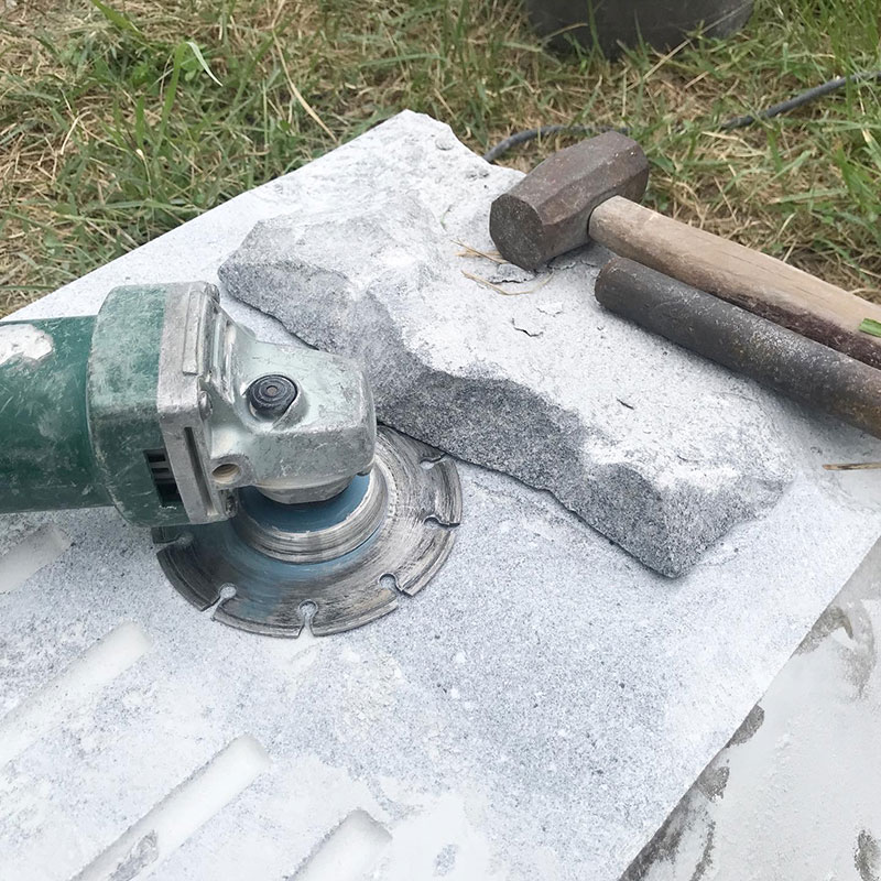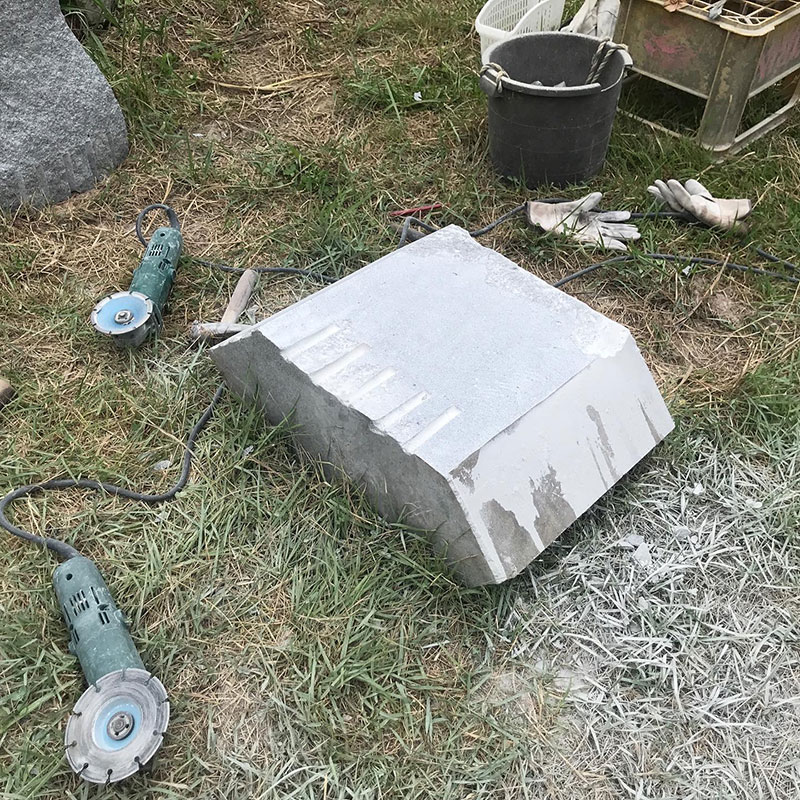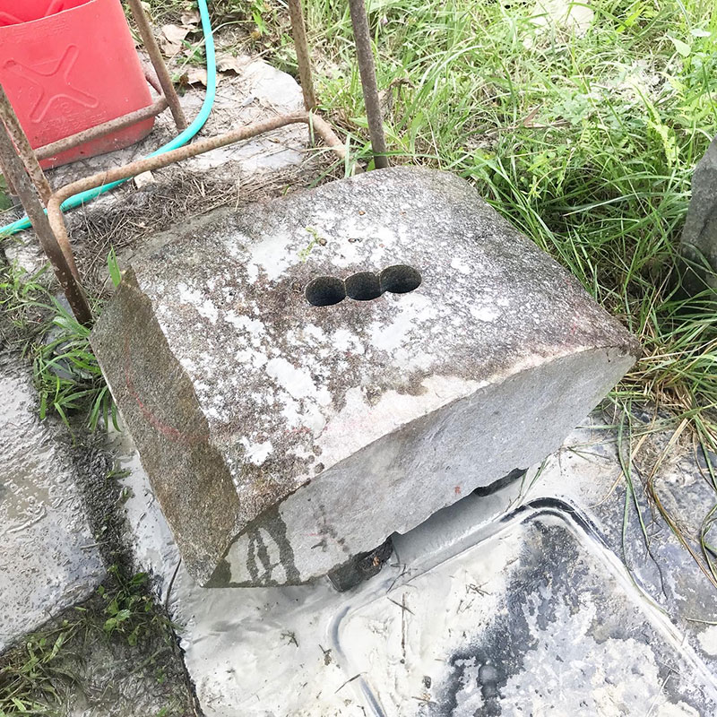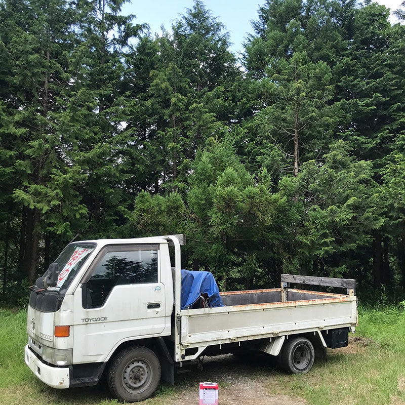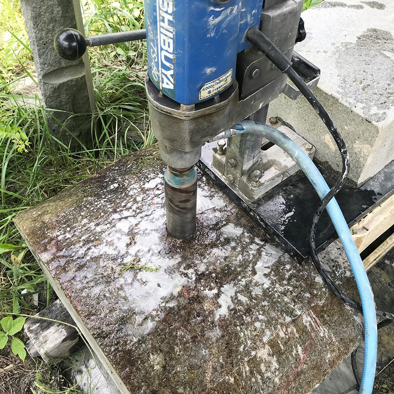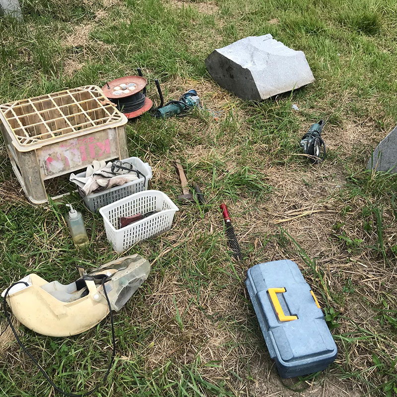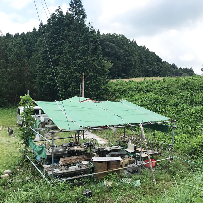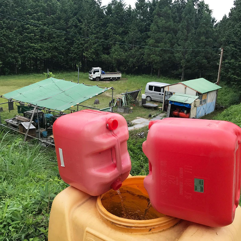 山の仕事場は水道が通っていないので磨きや穴あけに水を使うときは家からポリ缶に入れて運んで土手を登る。