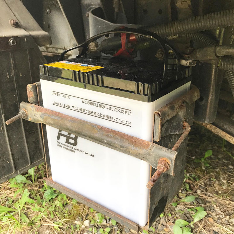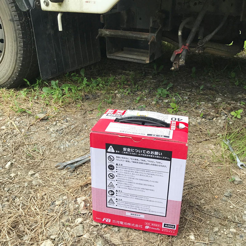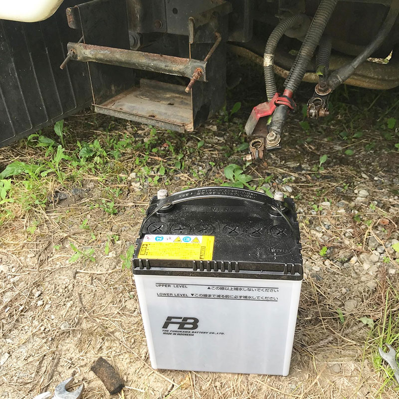 年代と形式で膨大なカタログから選んだユニック車のバッテリー。サイズが大き過ぎて所定の位置に収まらなかった。