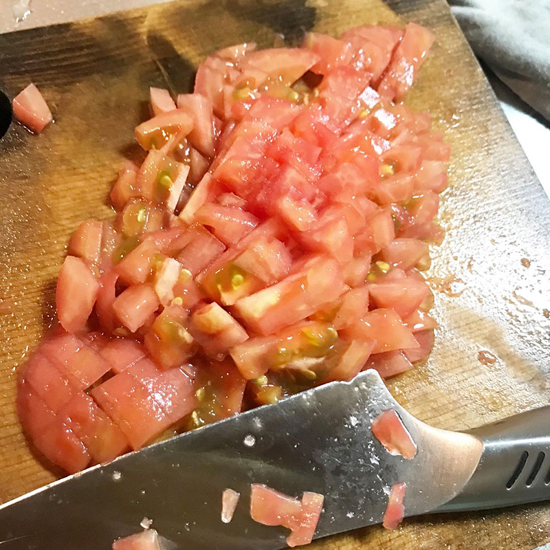 ツヴィリングの包丁だとトマトのみじん切りもスパスパ。