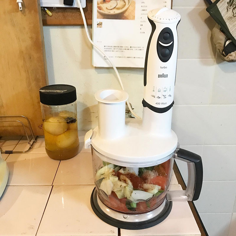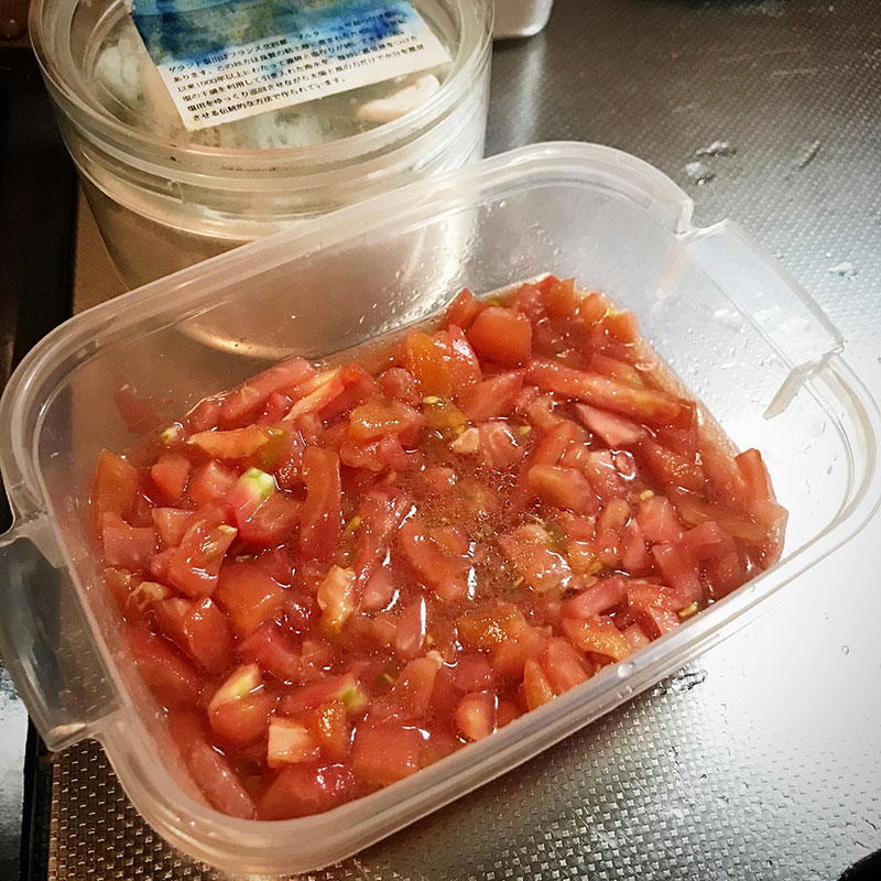 オリーブオイルや塩などと容器に入れて冷蔵庫でキンキンに冷やす。明日の昼飯に世紀の大発見、茹でない茹で方でカペッリーニを茹でて水で〆て合わせてトマトの冷製パスタにする。