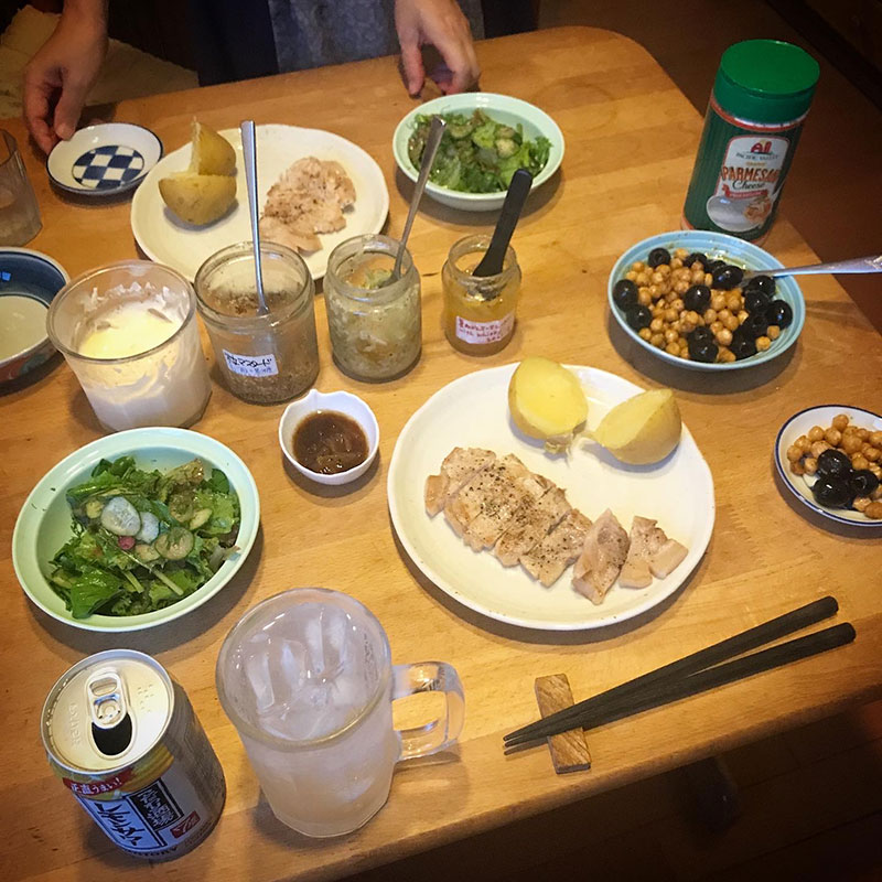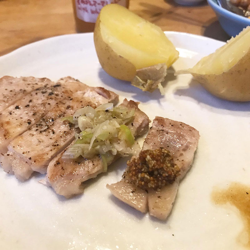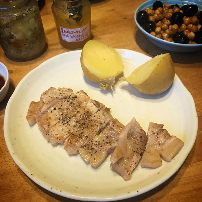 居酒屋我家、開店。夏みかんマーマレード with whisky を作って贈ってくれた恵さんがポークソテーに合うよーと教えてくれたのでちょっと良い豚肉買ってきた。畑からサラダ用の葉を何種類も摘んできてすりおろし玉ねぎとビーツのドレッシング。