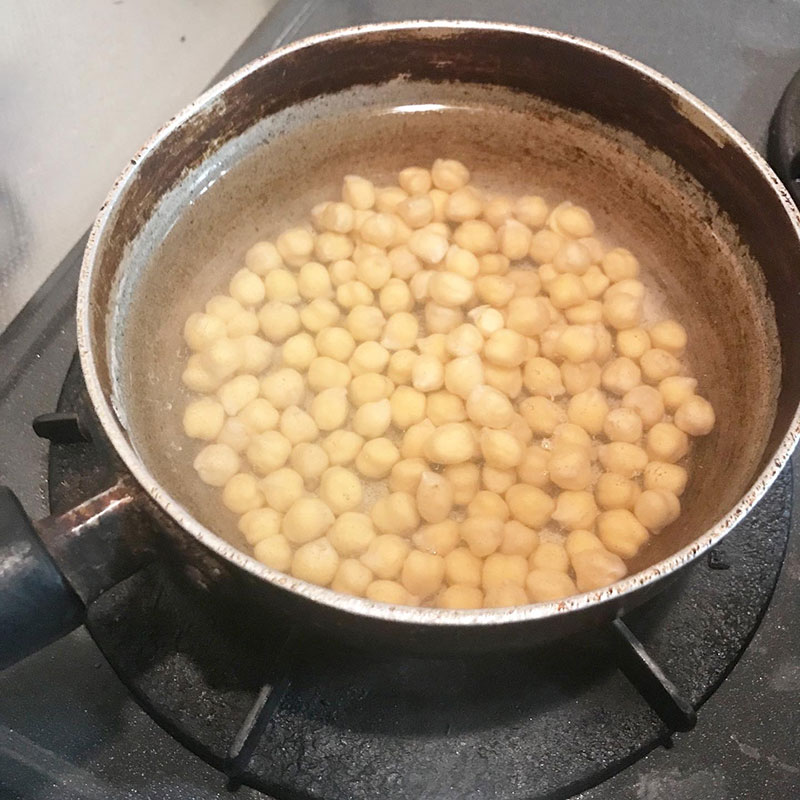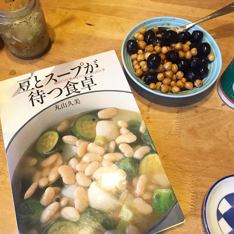 今宵の一品に昨日から水に浸しておいたひよこ豆を煮て黒オリーブとの炒めに。