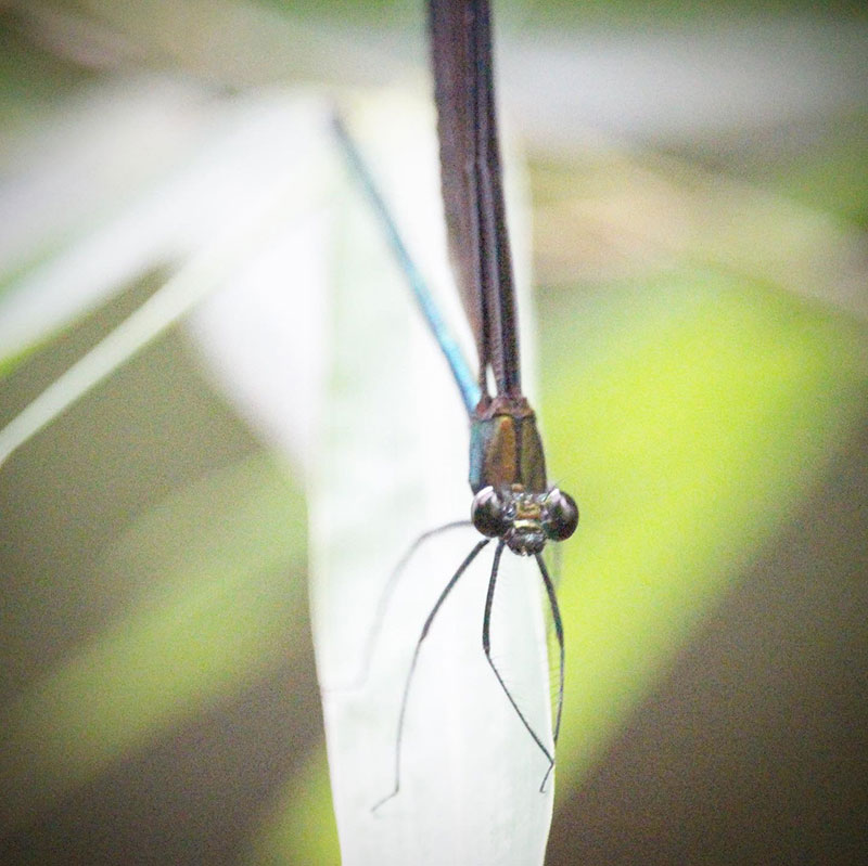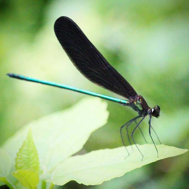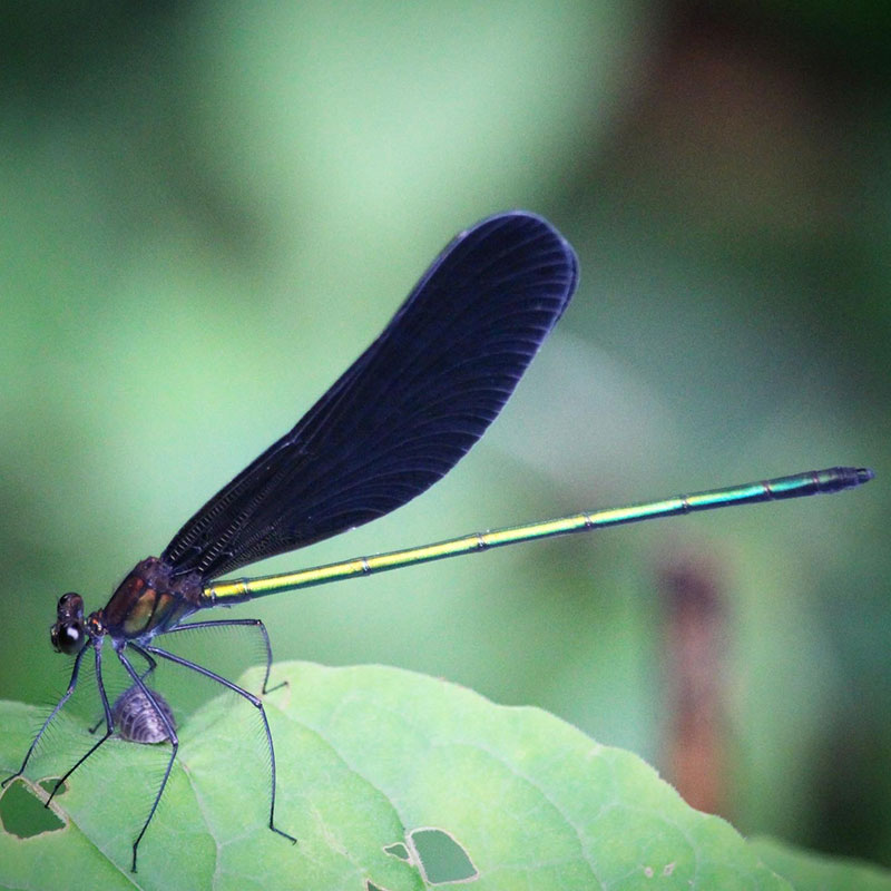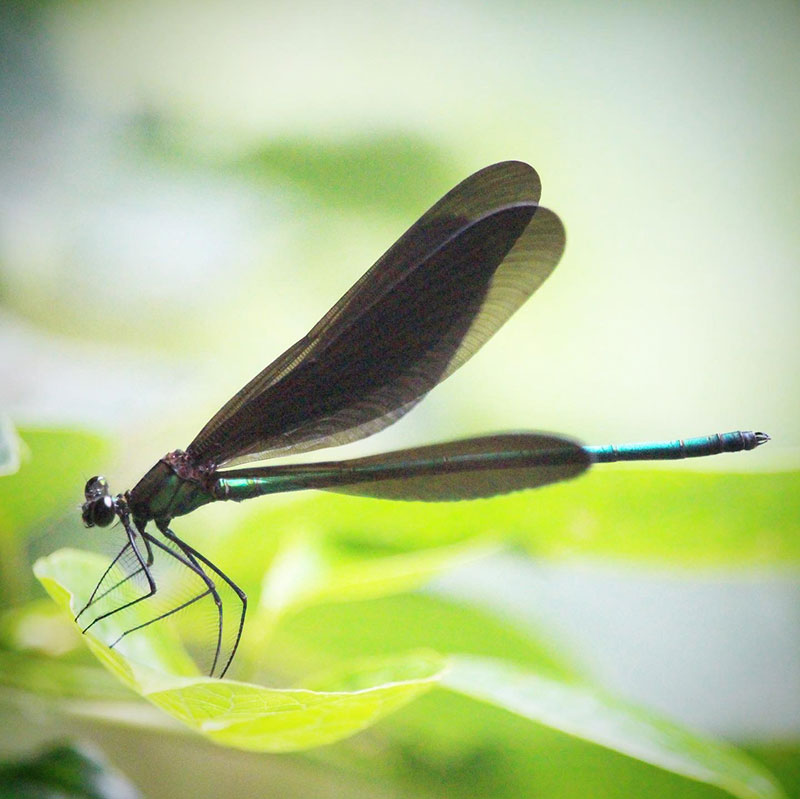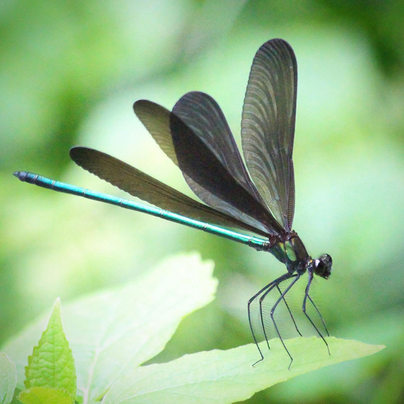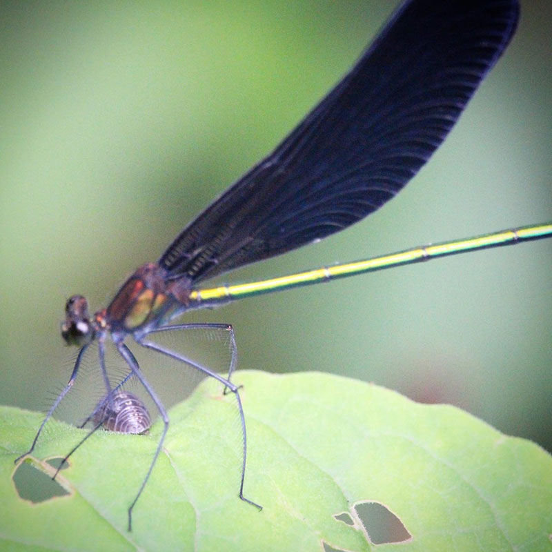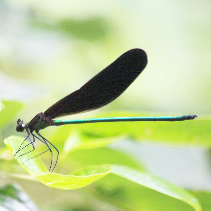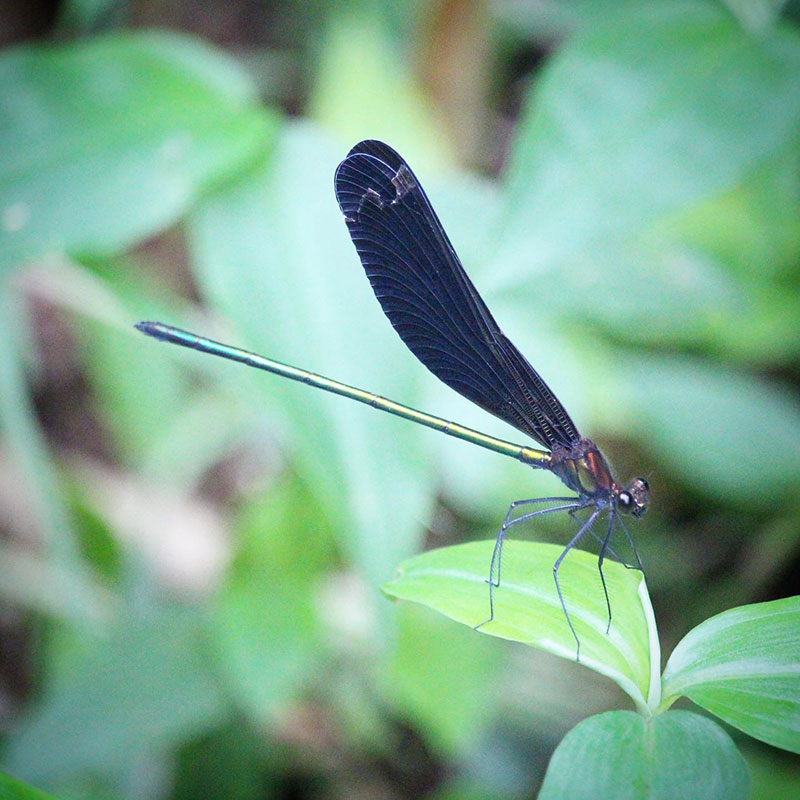 今日のハグロトンボ。裏山に緑に輝く尾のオス2匹とメス2匹と更に裏山を抜けた水路に小さなオス1匹を確認。