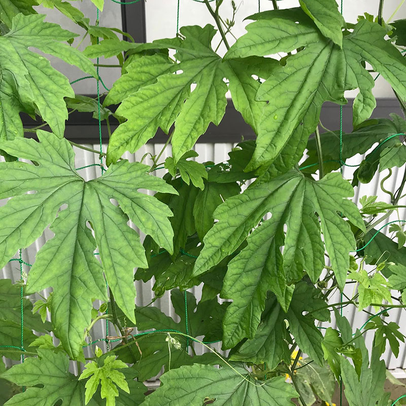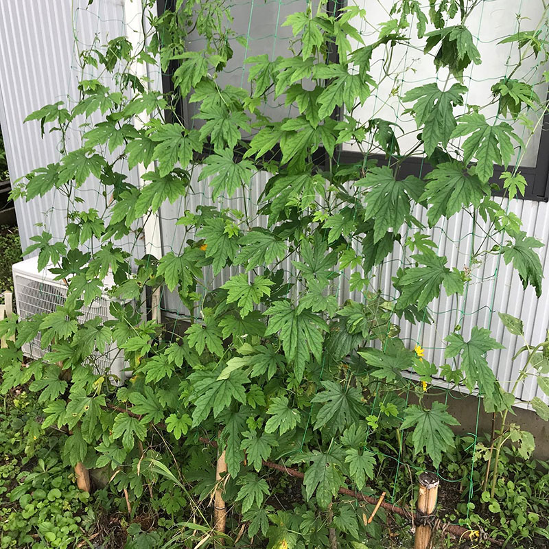 #tamaki緑のカーテン2021 定点観測。苗を植えてから74日目 蔓のひとつが網の一番上まで届いた。