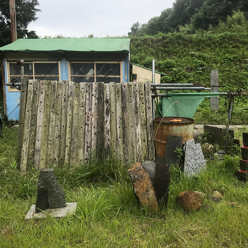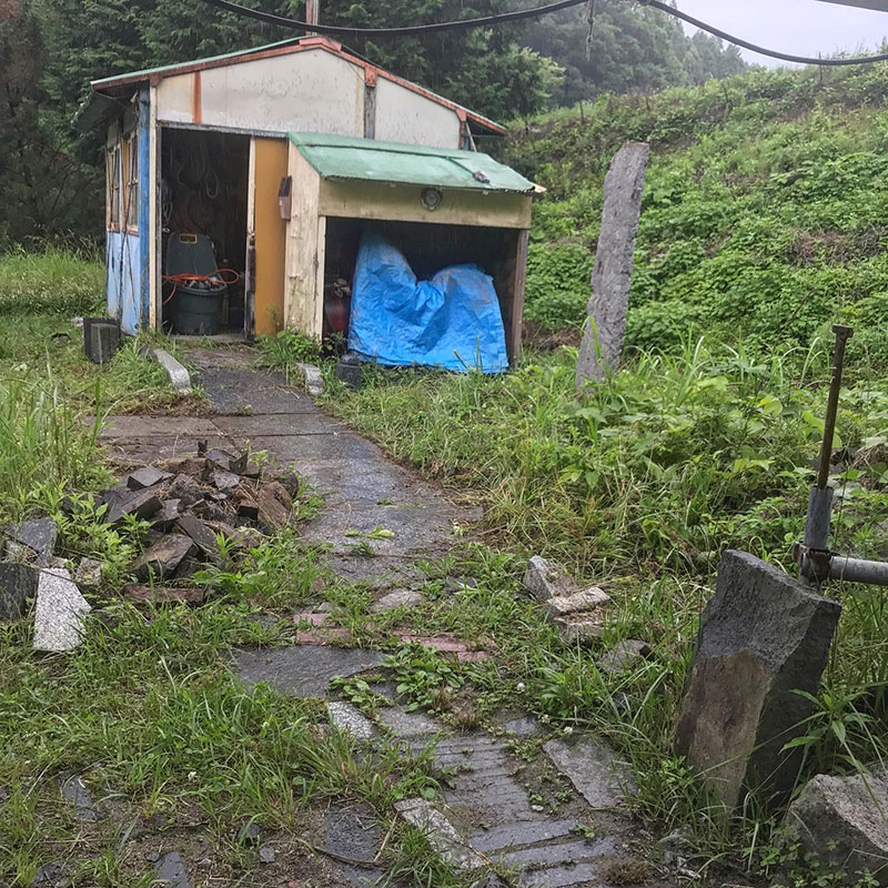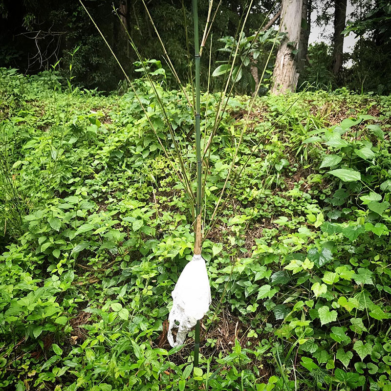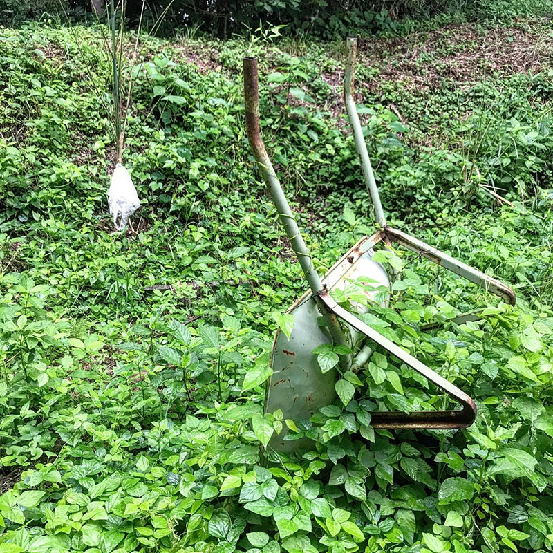 家の裏の草に飲み込まれた一輪車。その奥はコンビニの袋をドレスのように着た竹。