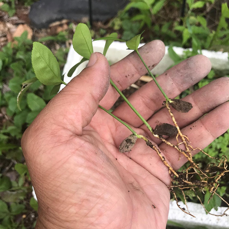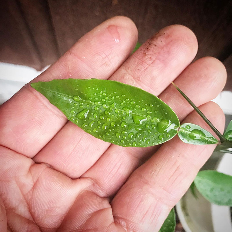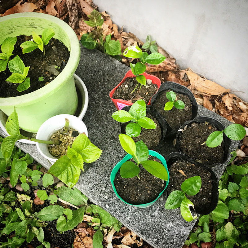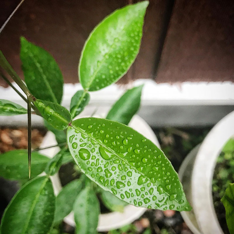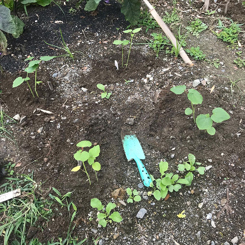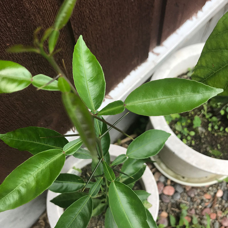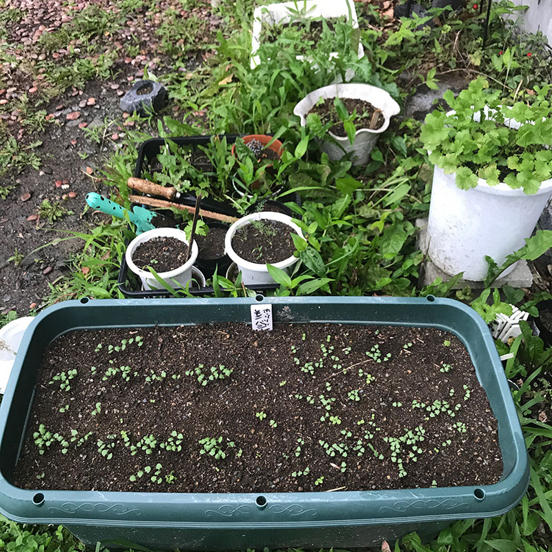 何の種をまいたかわからなくなったけど一斉に育ってる濃い緑の葉。ネットで画像検索したらどうやら柚子みたい。確かにまいた・笑