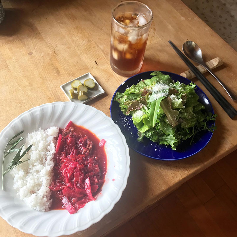 自家製きゅうりのピクルスの酸味がボルシチの甘さをより引き立ててくれる。