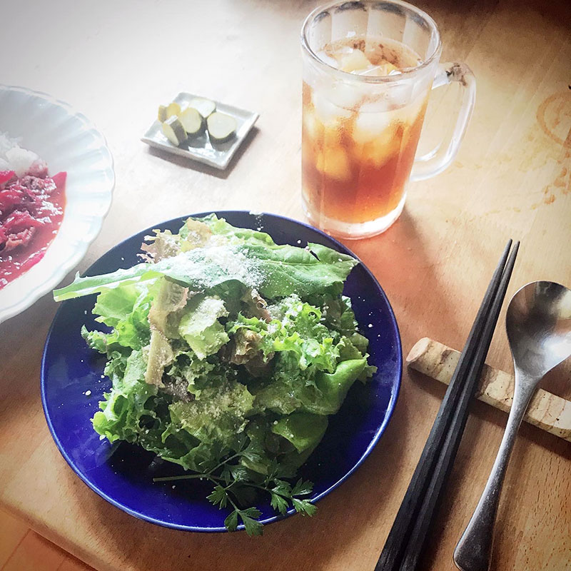 甜麺醤と山椒などと炒めた肉味噌と畑のニラをトッピング。白胡麻散らして完成。