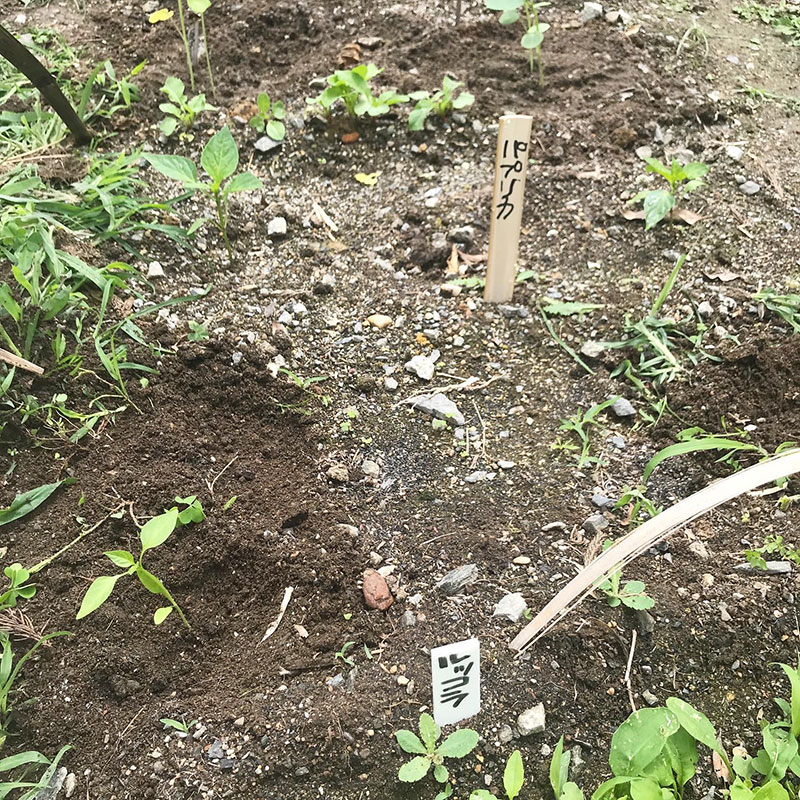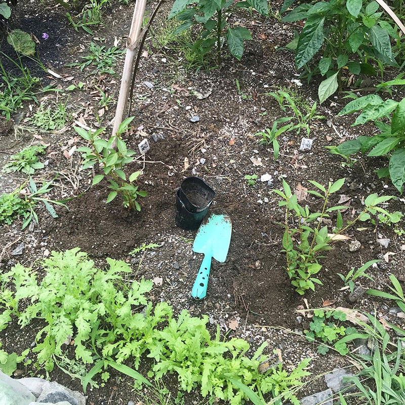 プランターの向かって左半分がレモンバジル、右半分がホーリーバジル。