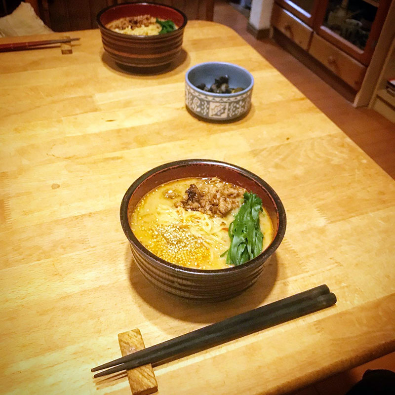 夕食に坦々麺作った。昨晩の火鍋に肉野菜きのこの出汁がたっぷり出てるのでそれをベースに幼なじみがくれた極みごまだれを贅沢に一瓶丸ごと使った。豆板醤と水を足して一煮立ちすればスープの出来上がり。