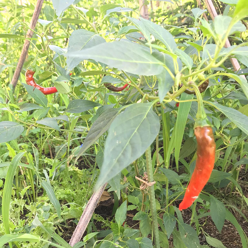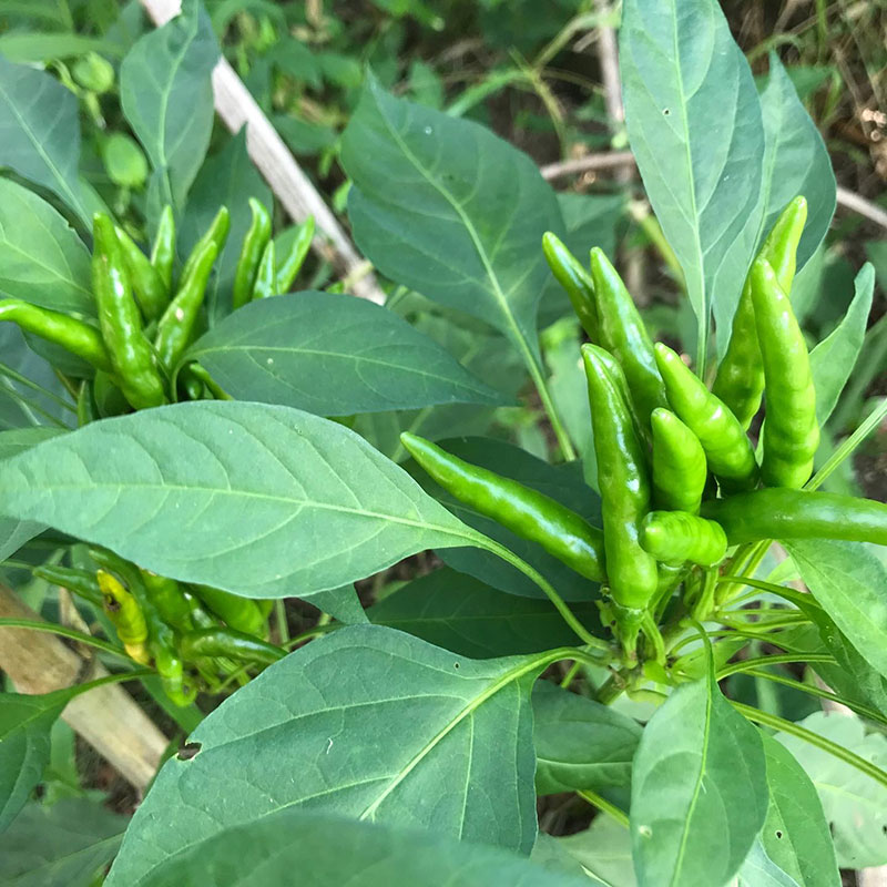 自家採種した唐辛子は小さい実をたくさんつけてまだ青々としてる。