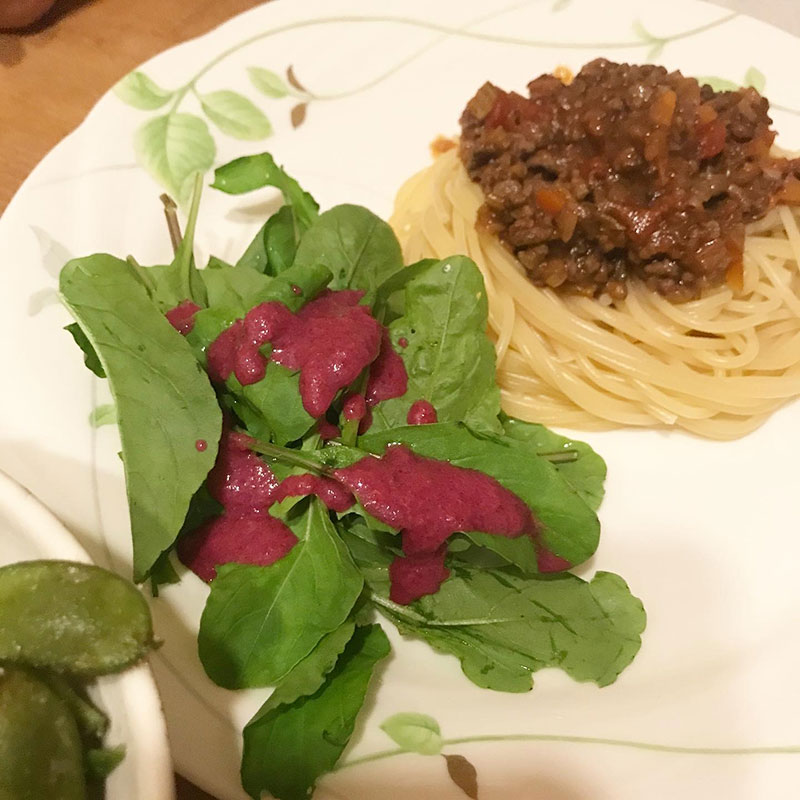 畑のルッコラの柔らかいところだけ摘んでビーツのピクルスを使って作ったドレッシングのサラダ。