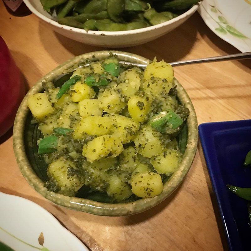 近所の方にいただいたポテトと畑のおくらのペスト・ジェノベーゼの和物。