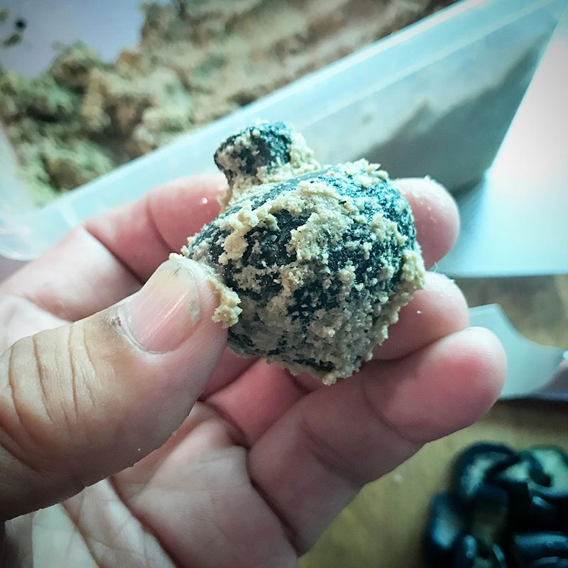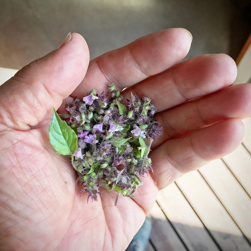 ホーリーバジルの花芽摘んで今日も石彫りに出かけよう。明日からずっと雨みたいだから貴重な制作日和だ!