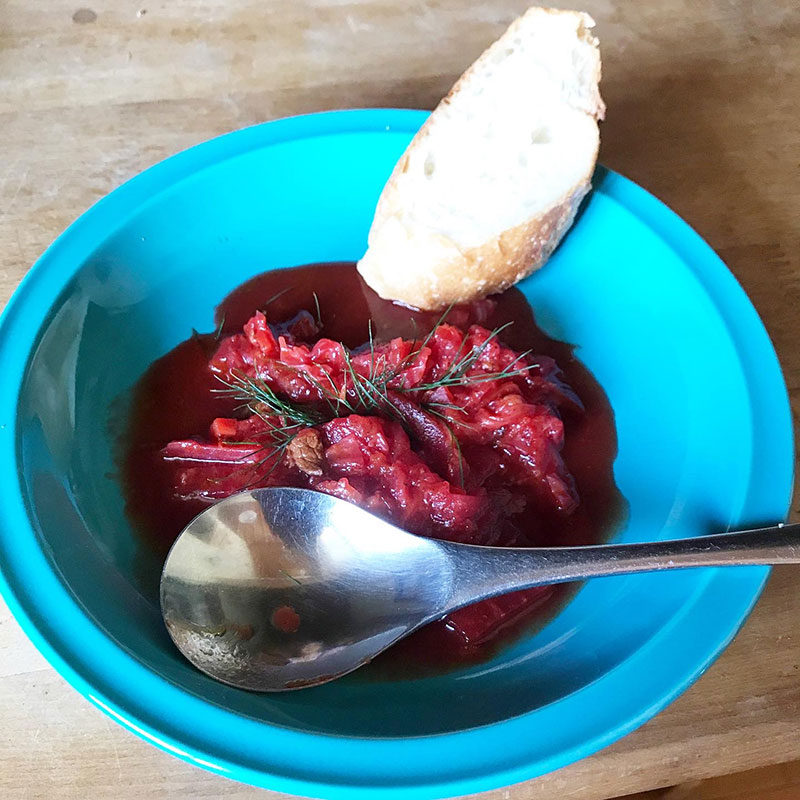 ボルシチが少しだけ残ってたので痛む前に朝食で食べてしまう。夏は一日二食を破って食べてしまう事多いな・汗