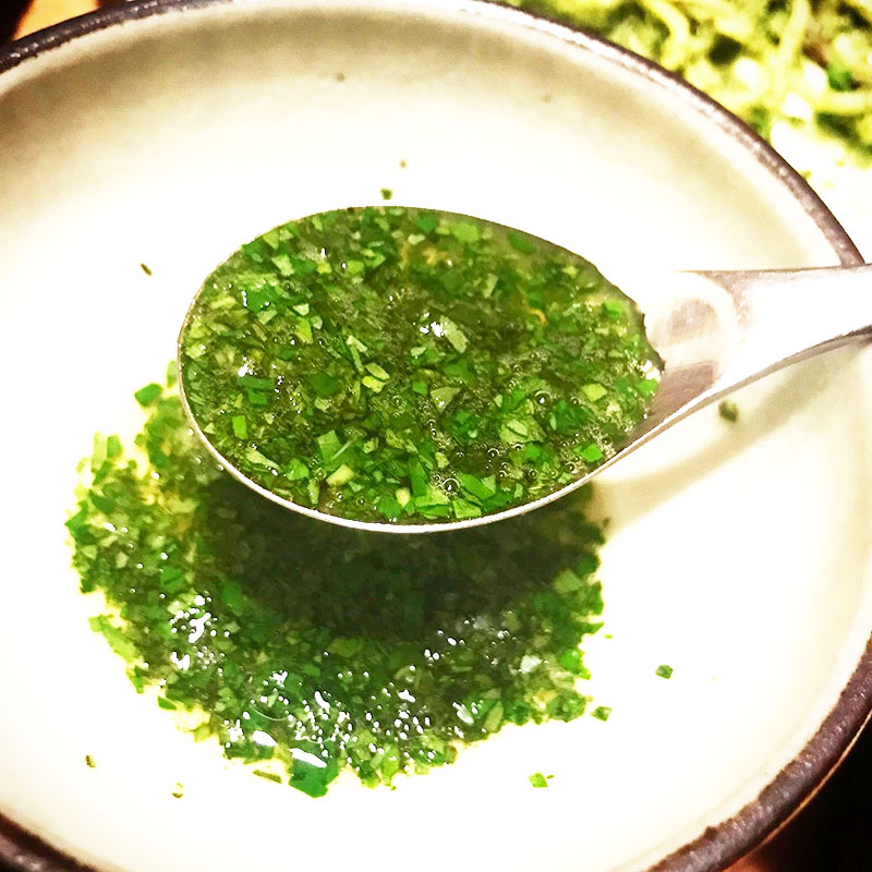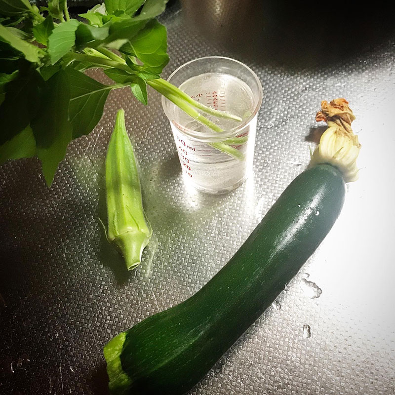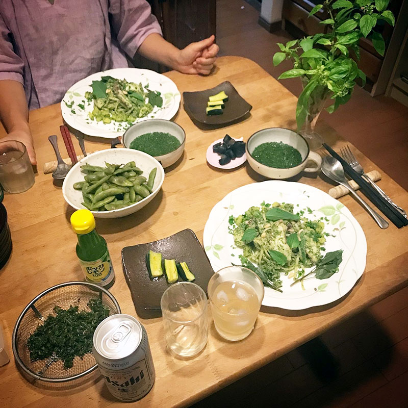 居酒屋我家、開店。昨晩、庭の畑で育ててるスイート、レモン、ブッシュ、ホーリーの4種類のバジルで仕込んだペスト・ジェノベーゼでポテトとオクラとタコのパスタ・ジェノベーゼ作った。追い松の実とレモンバジル、パセリ、さっと茹でたモロヘイヤと。