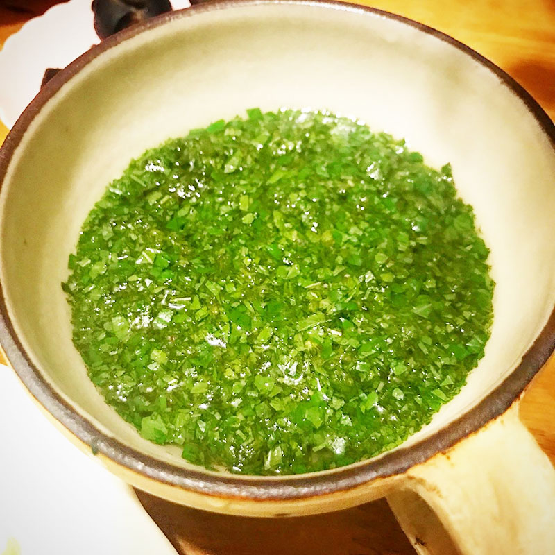 水に浸けてアクを抜いて食卓のガラスの器に塩漬けしてるホーリーバジルの爽やかな香りといったら!
