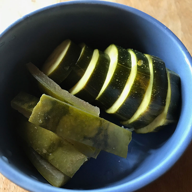 スイカの皮とズッキーニのぬか漬け。スイカの皮、ちょっと堅い。