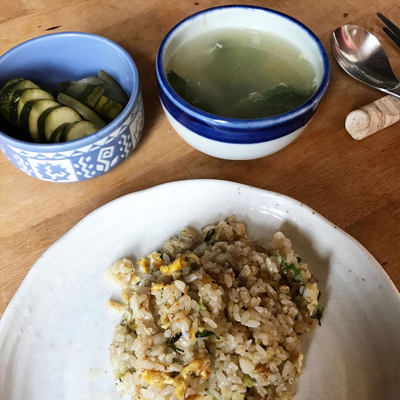 昼飯に定番の炒飯作った。具は卵と畑の長ネギだけ。