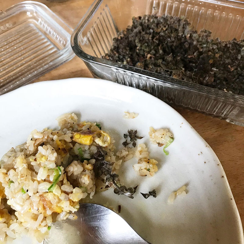 バジルを長持ちさせるために毎朝摘んだ花芽に塩して食卓のガラスの器に入れてるだけのホーリーバジルの花芽の塩漬け。連日、大活躍中。今日も炒飯にかけたら美味しさアップ。これ思いついた自分、マジで褒めてあげたい・笑