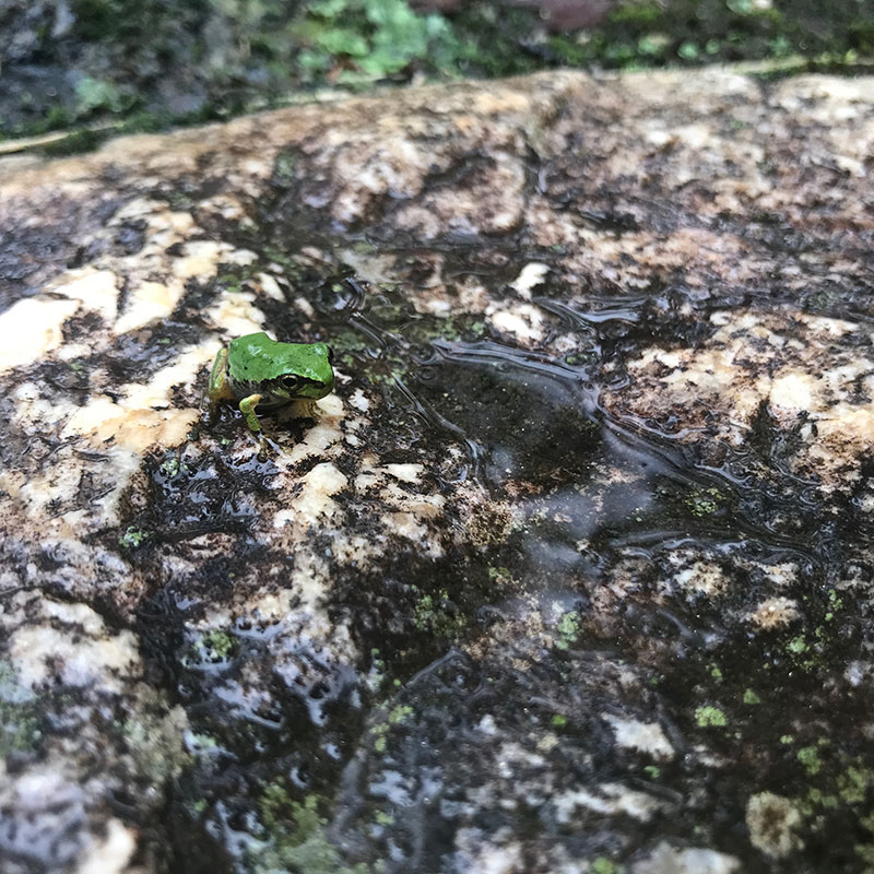 参道にはこれまで見た中で一番小さなアマガエルが跳ねていた。がんばれー!