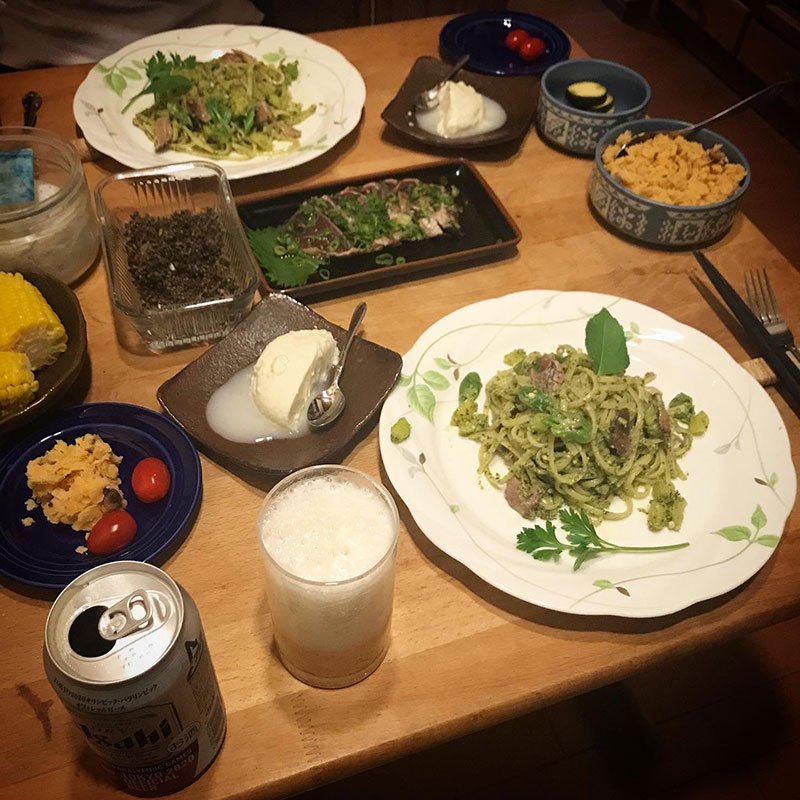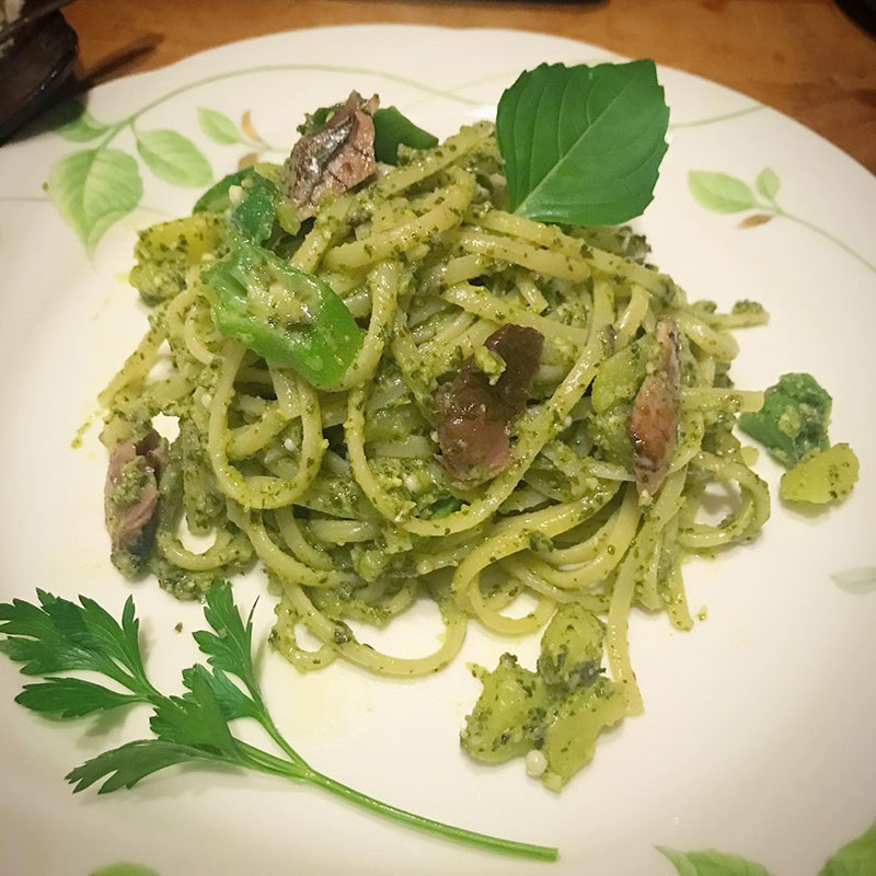 ベスト・ジェノベーゼの作り置きでポテトとオクラと鰹のジェノベーゼ・パスタ。畑のイタリアンパセリとレモンバジルを添えて。