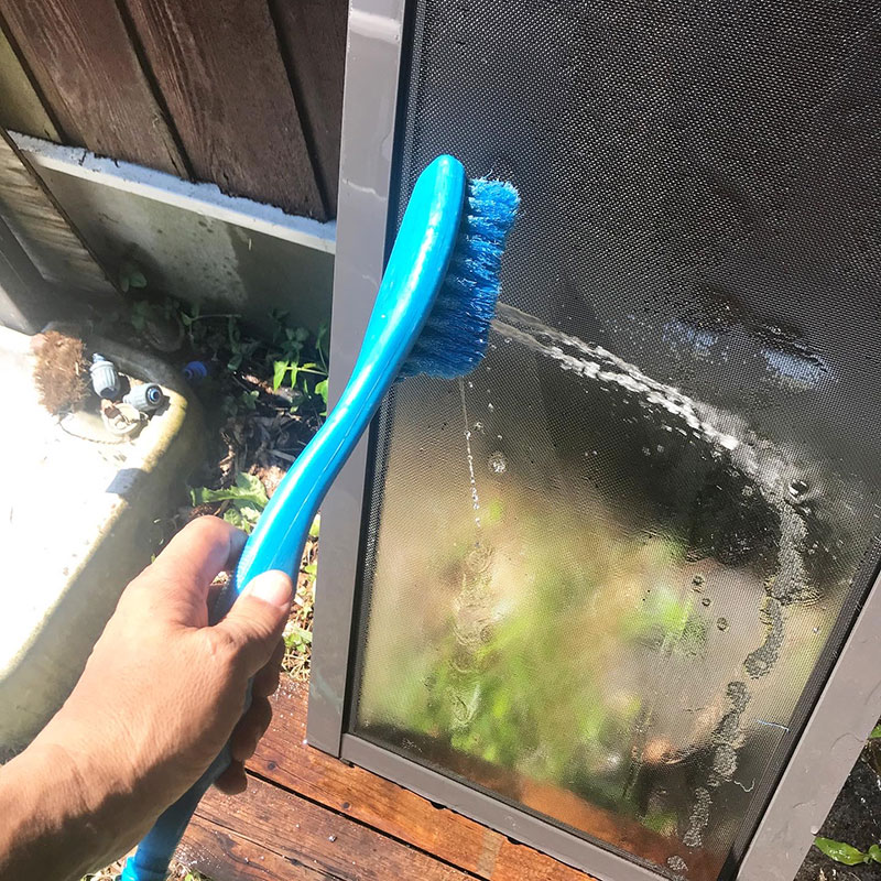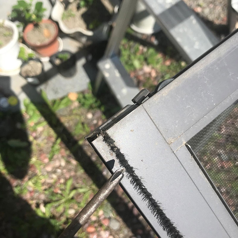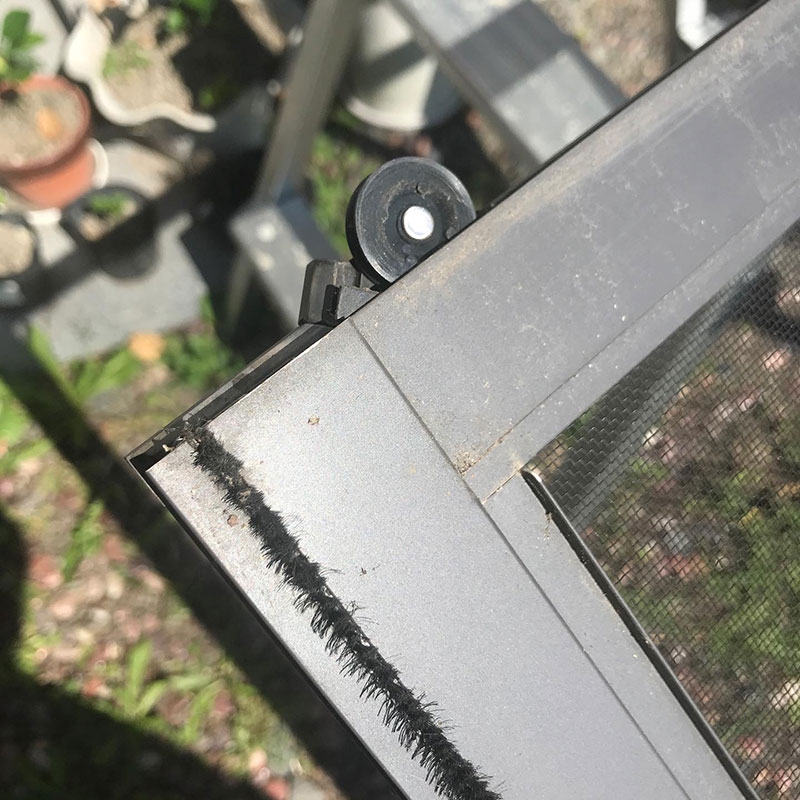 湿気が多い側の網戸は苔が生えてるので高所で4ヶ所ネジをゆるめて網戸を外して降りてくる。