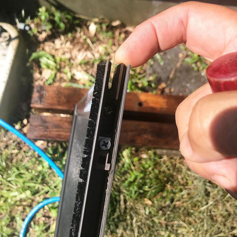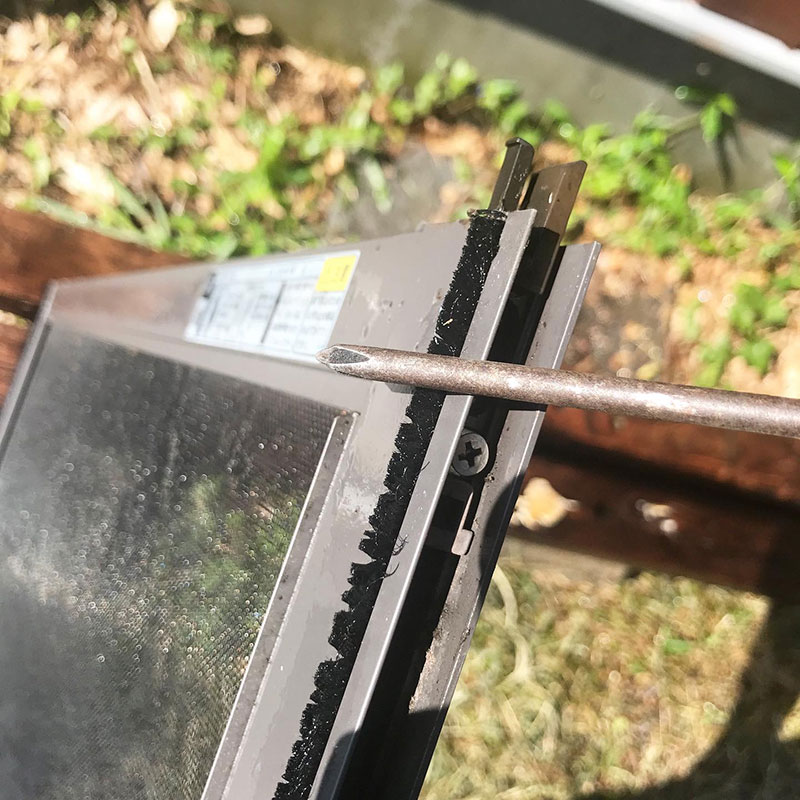 ひどく汚れている窓ガラスも外して洗うのでドライバーを使って外れ防止の器具を緩めていく。