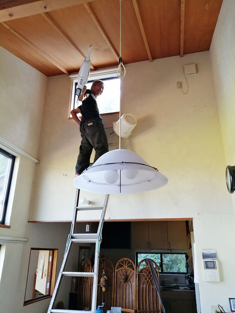 高梯子で拭き上げた。