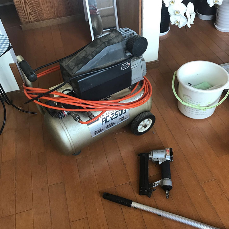 重いコンプレッサーを2階に上げて