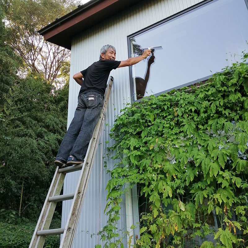 靴を持ってきて玄関の庇の上に乗って外からいろんなところに掴まりながら窓を拭き上げていく。足元の勾配が強いので滑り落ちないように気をつけて作業してるのにこんな時に限ってスズメバチの来襲。