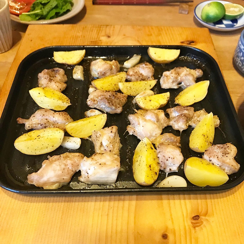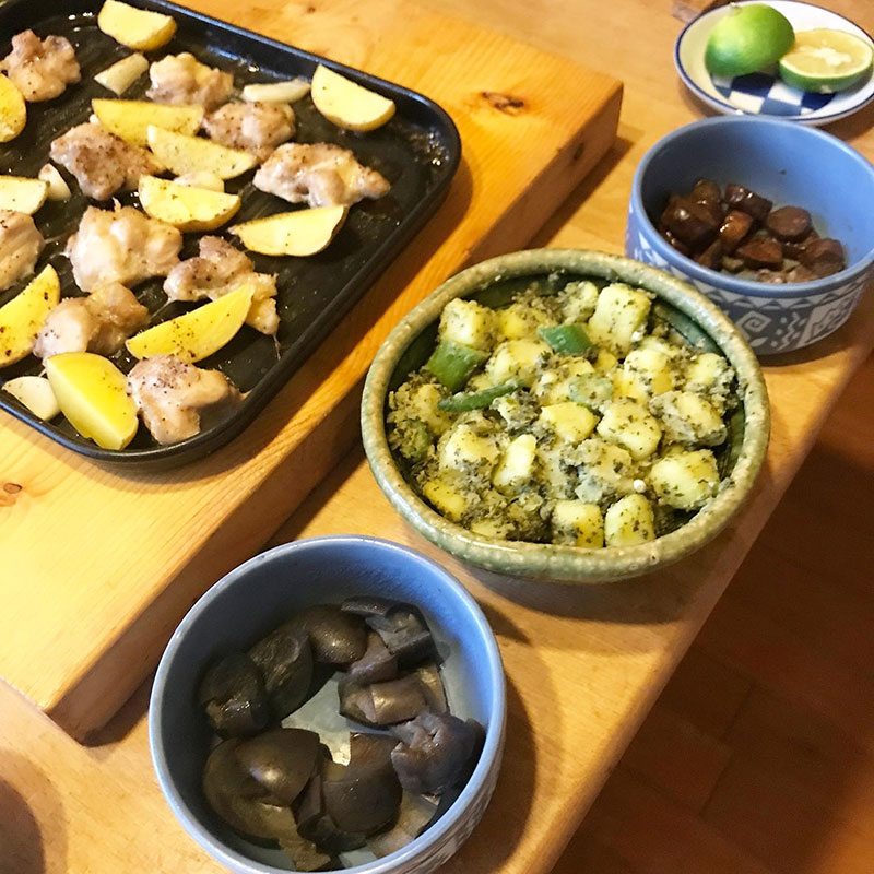 材料を切ったら後はトースターにお任せ。スペインの幸せな一品。カミさん、宮城のコロナが酷くてオンライン・レッスンに切り替えてるからにんにくも入れてた・笑